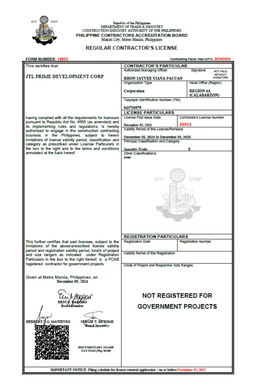Rhon Jayvee Pacuan leads JTL Prime Development Corporation as its President and Managing Director, overseeing the company’s strategic direction, operations, and overall performance. As the driving force behind the business, he works closely with all departments—from design to site execution—to ensure that every project meets the company’s standards for quality, integrity, and innovation. With a strong focus on growth, team development, and client trust, he guides JTL Prime with a clear vision and a hands-on approach, making sure that the company delivers not just buildings, but value-driven results that last.